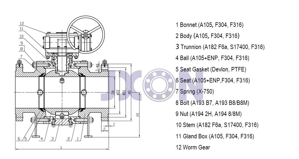 Materials of worm gear trunnion flanged ball valves